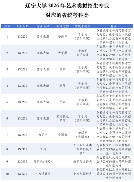 根據(jù)上級(jí)管理部門(mén)要求,現(xiàn)將遼寧大學(xué)2026年藝術(shù)類(lèi)擬招生專(zhuān)業(yè)對(duì)應(yīng)的省統(tǒng)考科類(lèi)公布如下,是否招生以及招生規(guī)模以后續(xù)公布的招生簡(jiǎn)章和招生計(jì)劃為準(zhǔn)。