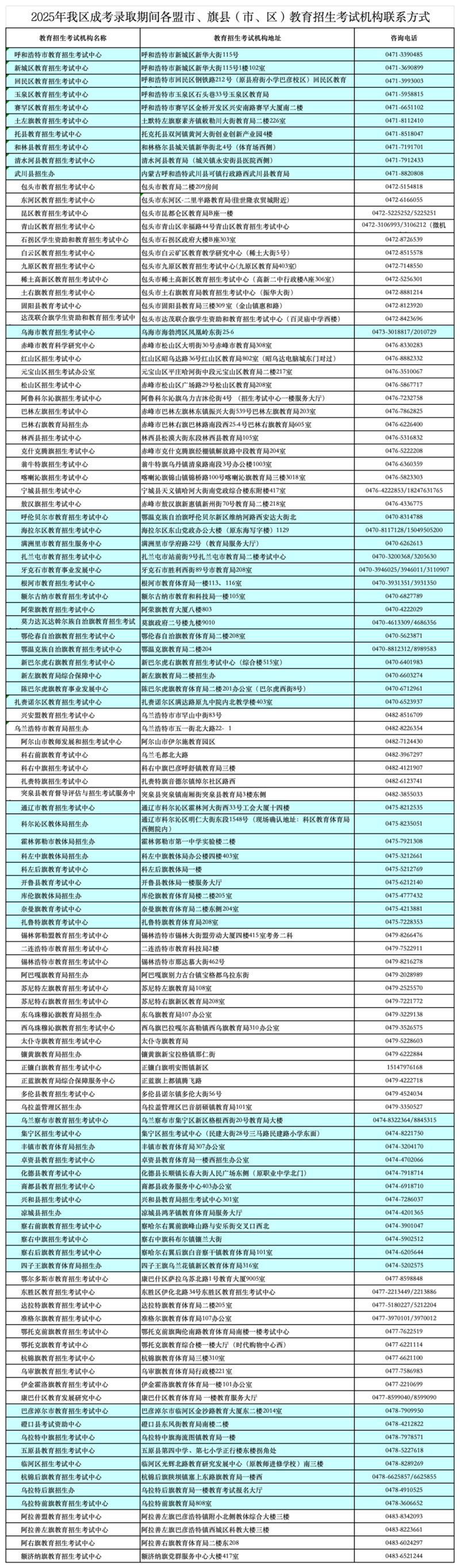 | 2025年內蒙古成考錄取期間各盟市、旗縣(市、區)教育招生考試機構咨詢電話 |