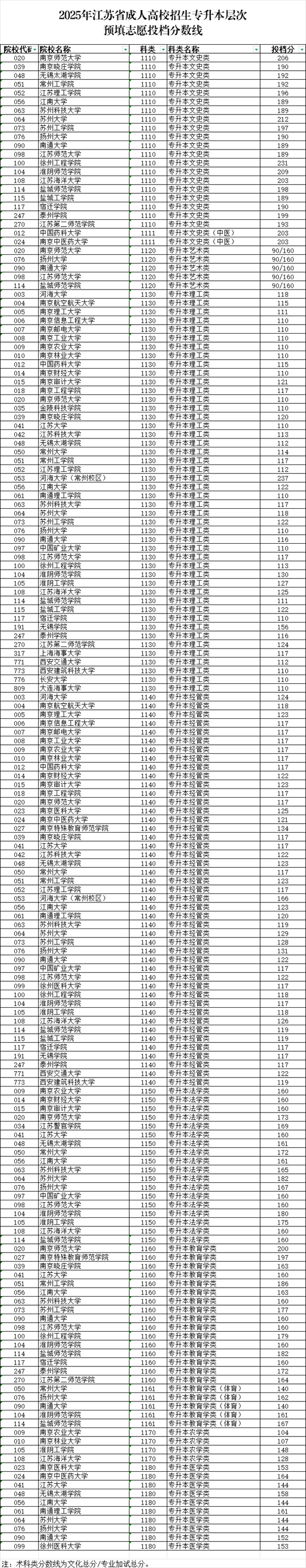 2025年江蘇省成人高校招生專升本層次預填志愿投檔分數線
