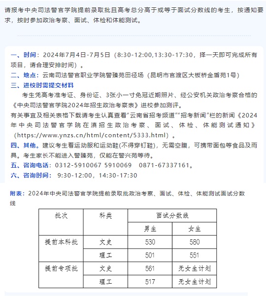 | 云南:2024年中央司法警官學(xué)院提前錄取批政治考察面試體檢體能測(cè)試相關(guān)要求及面試分?jǐn)?shù)線 |