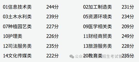 信息技術(shù)類、加工制造類、土木水利類、資源環(huán)境類、種植園藝類、醫(yī)學(xué)相關(guān)類、護(hù)理類、財(cái)經(jīng)商貿(mào)類、司法服務(wù)類、旅游服務(wù)類、文化傳媒類、教育類錄取時(shí),職業(yè)技能考試合格的考生,在各專業(yè)錄取最低控制分?jǐn)?shù)線上,按考生文化素質(zhì)總成績(jī)和志愿,從高到低投檔,由招生院校擇優(yōu)錄取。