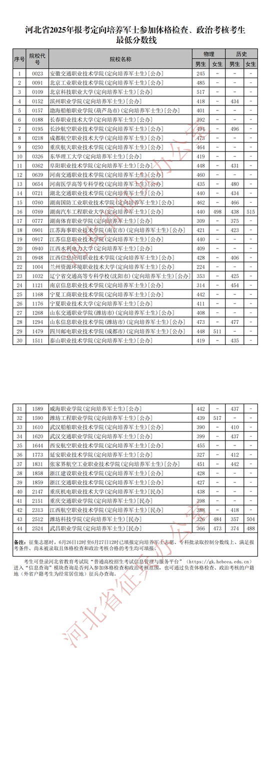 | 河北省2025年報考定向培養軍士參加體格檢查、政治考核考生最低分數線 |