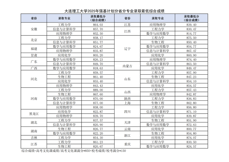 大連理工大學2025年強基計劃分省分專業錄取最低綜合成績