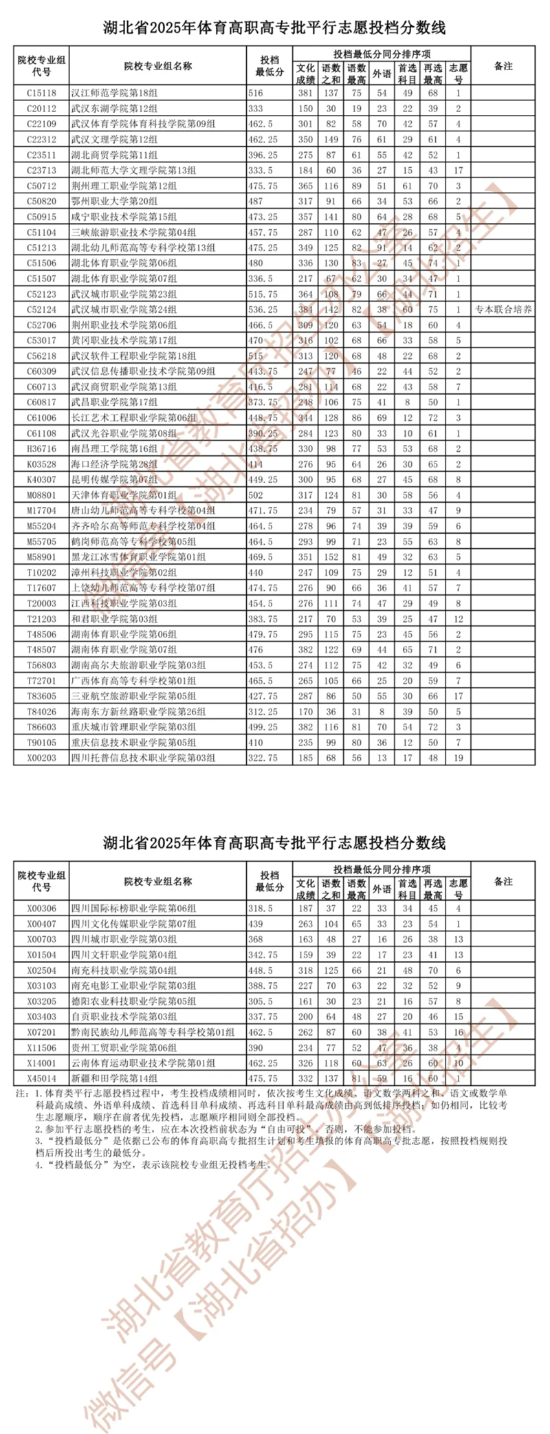 湖北省2025年體育高職高專批平行志愿投檔分數(shù)線