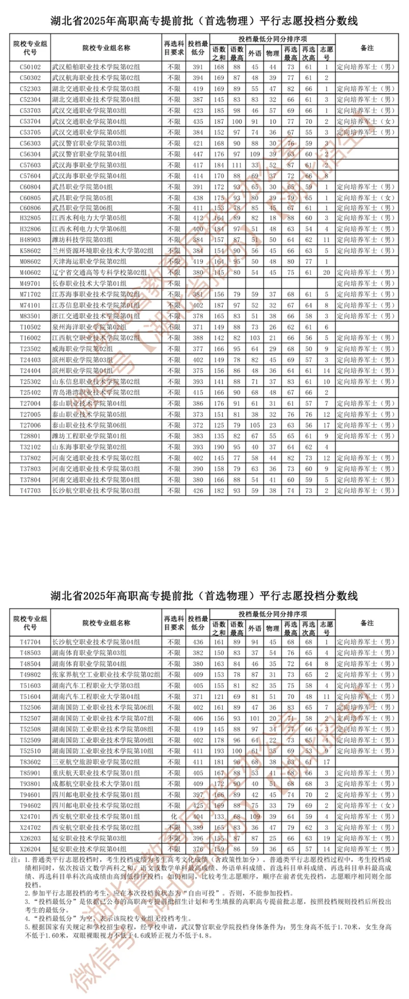 湖北省2025年高職高專提前批(首選物理)平行志愿投檔分數線