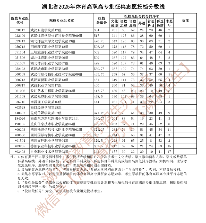 湖北省2025年體育高職高專批征集志愿投檔分數(shù)線