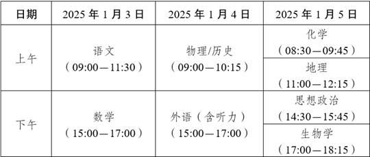適應性測試時間為2025年1月3-5日,具體安排如下: