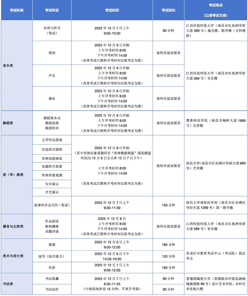 | 江西省2026年藝術(shù)類專業(yè)統(tǒng)考各科類(科目)考試時間、考點安排 |