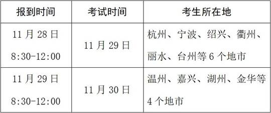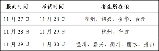 本次考試時間為11月28日—30日,按地區分三批在金華職業技術大學進行。考生須于考試前一天,持本人身份證到組考學校辦理報到手續,填寫考點規定的表格,領取準考證,了解考試安排情況。報到地點見金華職業技術大學招生網(https://zsw.jhc.edu.cn)通知。具體時間安排如下: