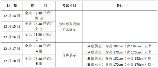 1.形體形象觀測、才藝展示:男生2025年12月14日考試,女生2025年12月15日-16日考試。上午8:30考試,下午13:00考試,上午單元未考完,下午單元考試順延。檢錄時(shí)間為上午8:00-8:45,下午12:30-13:15,未按規(guī)定時(shí)間檢錄和參加考試的,視為放棄考試。〔形體形象觀測(四樓402室),才藝展示(一樓101表演廳)〕。