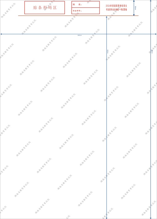 書法評卷采取計算機輔助評卷方式,要保持條形碼及條形碼粘貼區域(紅線以上區域,下同)清潔,嚴禁在條形碼上或條形碼粘貼區域涂抹。同時,請考生按照《湖南省2026年普通高校招生書法類專業統一考試考生守則》(見附件1)做好相關準備工作。