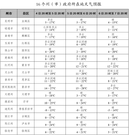 預(yù)計12月4日20時至7日20時,昭通市、曲靖市東部、文山州東部、紅河州南部、普洱市東南部多云間陰有小雨,其他大部分地區(qū)晴間多云。