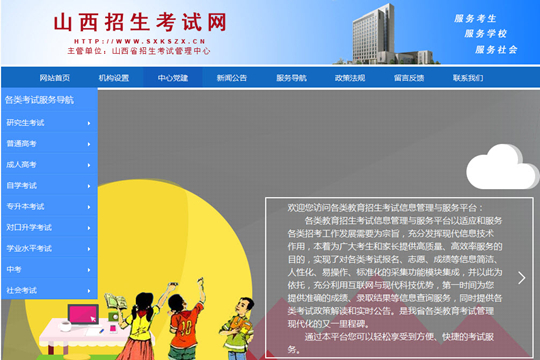 山西招生考試網(http://www.sxkszx.cn)是山西省各類教育招生考試信息發布、信息采集的重要平臺,是山西省對口升學考試網上填報志愿的唯一網站。