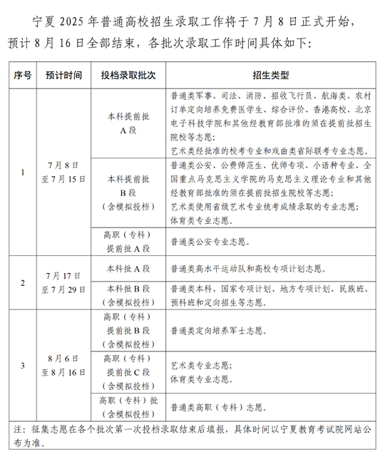 寧夏2025年普通高校招生錄取時(shí)間安排