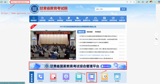 訪問甘肅省教育考試院官網https://www.ganseea.cn,點擊“信息查詢”模塊進入“高考錄取查詢”頁面進行查詢;也可點擊甘肅省教育考試院官網“甘肅省國家教育考試綜合管理平臺”長圖,訪問“考生入口”并登錄后進行查詢。