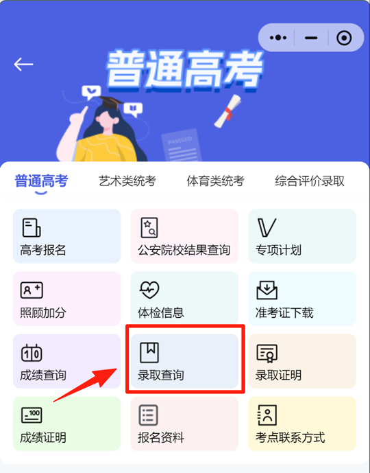 微信搜索“甘肅招考”小程序,進入首頁后點擊“普通高考”圖標,登錄后點擊“錄取查詢”圖標進行查詢。