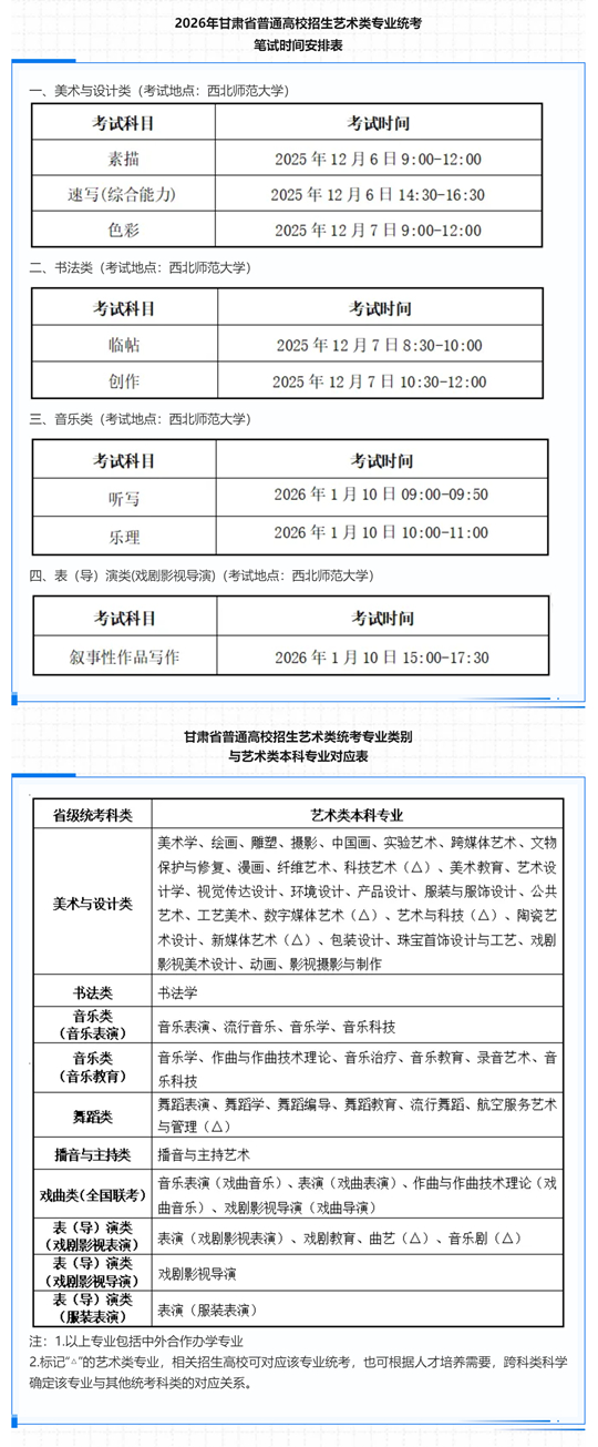 1.2026年甘肅省普通高校招生藝術類專業統考筆試時間安排表