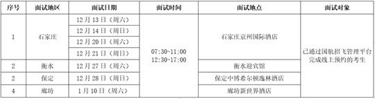 (二)預選初檢:登錄“國航招飛管理平臺”填寫信息、預約場次,已預約考生嚴格按照預約時間參加國航招飛辦公室組織的現場初檢面試(含飛行職業能力傾向測試、英語測試、面試等);