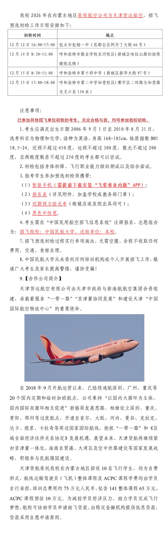 中國民航大學內蒙古地區2026年招飛預選初檢日程安排
