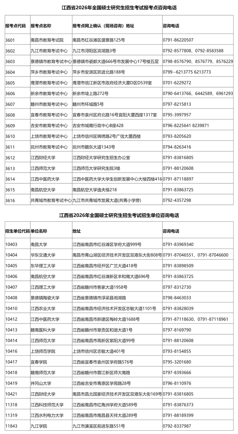江西省2026年全國碩士研究生招生考試報考點(diǎn)和招生單位咨詢電話