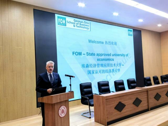 講座中,Andreas Stoffers教授圍繞FOM大學的課程體系與核心優勢展開分享。他詳細介紹了該校在應用型人才培養方面的特色課程設計,以及與行業接軌的教學模式,讓在場師生對德國高等教育的實踐導向有了直觀認識。