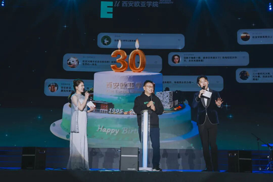 “祝你生日快樂,祝你生日快樂……”當(dāng)天幕中的巨型生日蛋糕緩緩盤旋時,西安歐亞學(xué)院創(chuàng)辦人、董事長胡建波也為舞臺中央大屏幕里的“賽博蛋糕”點亮“電子蠟燭”,臺下觀眾齊聲合唱生日快樂歌,共同見證歐亞翻開“而立”之頁。