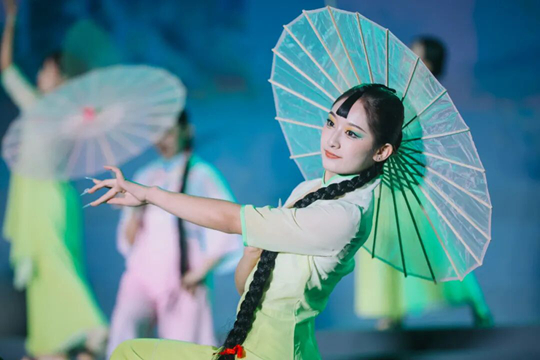 民舞團的舞者撐著透明油紙傘輕盈舞動,將古典意境里雨打芭蕉的柔與靈,具象成指尖的婉轉(zhuǎn)以及裙擺的輕搖。