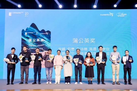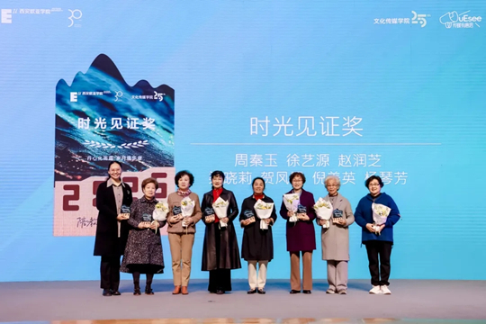 頒獎(jiǎng)環(huán)節(jié),西安歐亞學(xué)院董事長(zhǎng)胡建波教授為文化傳媒學(xué)院首任院長(zhǎng)劉建勛頒發(fā)“文傳奠基獎(jiǎng)”。當(dāng)周秦玉、徐藝源、趙潤(rùn)芝等7位退休教職工登臺(tái)時(shí),臺(tái)下響起熱烈的掌聲,文化傳媒學(xué)院老師閆晉瑛為他們頒發(fā)“時(shí)光見證獎(jiǎng)”并合影留念。辛峰、侶懋、張?jiān)婇?0位優(yōu)秀校友獲得“蒲公英獎(jiǎng)”,他們?cè)忈屃藗髅饺巳绾卧诓煌寥乐猩l(fā)芽,文化傳媒學(xué)院副院長(zhǎng)曹小娟為他們頒獎(jiǎng)。“薪火相傳”時(shí)刻,老院長(zhǎng)劉建勛將使命傳遞給文化傳媒學(xué)院6位新進(jìn)教師,前浪引后浪,傳承在此刻接力交匯。