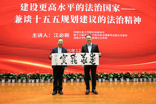 報(bào)告會(huì)前,江必新教授向?qū)W校贈(zèng)送書法作品。隨后,他從“建設(shè)更高水平社會(huì)主義法治國(guó)家的背景與意義”“所需達(dá)到的要求和應(yīng)遵循的標(biāo)準(zhǔn)”“可采取的路徑及相應(yīng)舉措”三個(gè)維度展開系統(tǒng)闡述,提出“實(shí)現(xiàn)更具實(shí)效性的憲法實(shí)施”“構(gòu)建更具韌性的嚴(yán)格執(zhí)法體系”“打造更具效能的公正司法環(huán)境”等八項(xiàng)核心觀點(diǎn),涵蓋憲法實(shí)施、科學(xué)立法、嚴(yán)格執(zhí)法、全面監(jiān)督、公正司法、普惠法律服務(wù)、全民守法及涉外法治建設(shè)等領(lǐng)域,為法治實(shí)踐提供理論指引。