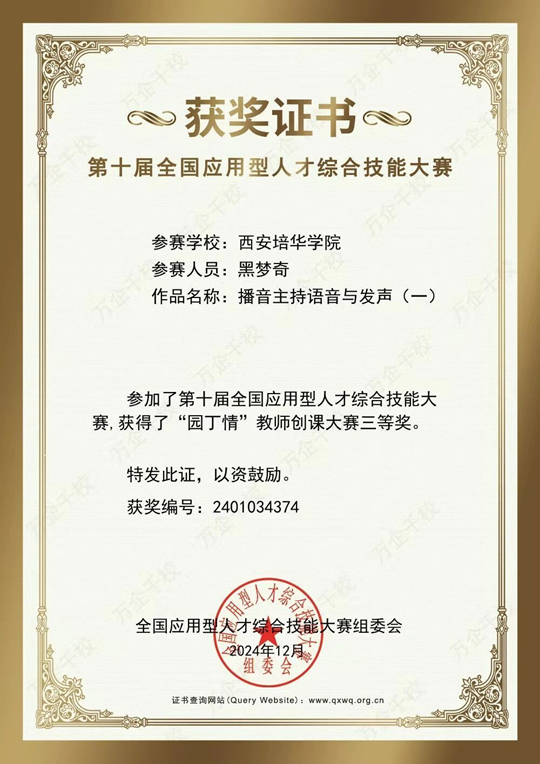 黑夢奇老師受邀參與央視紀錄片配音并非偶然。作為陜西省朗誦協會理事、西安培華學院大學生朗誦藝術團指導教師,她曾獲第五、六、七屆中華經典誦讀大賽陜西省賽區一等獎,并榮獲第七屆中華經典誦寫講大賽全國一等獎。