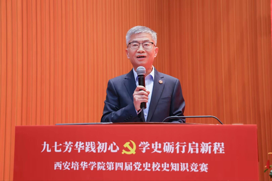 姜波理事長(zhǎng)為大賽致辭。他指出,培華擁有與中國(guó)共產(chǎn)黨風(fēng)雨同舟的百年紅色校史,作為唯一一所自民國(guó)時(shí)期以來始終致力于女性教育與職業(yè)教育的民辦高校,形成了獨(dú)特的奮斗傳統(tǒng)與紅色根脈。本次競(jìng)賽不僅是一場(chǎng)知識(shí)競(jìng)技,更是一次深刻的思想淬煉。學(xué)習(xí)黨史校史,關(guān)鍵在于深刻領(lǐng)悟幾代培華人用青春與熱血鑄就的鮮活歷史。學(xué)校自1928年創(chuàng)立之初便提出的七條育人準(zhǔn)則,以及此后“以人為本 以德為先”的辦學(xué)理念,至今仍具有鮮明的時(shí)代價(jià)值。培華學(xué)子應(yīng)借助競(jìng)賽這一鮮活形式,超越單純的知識(shí)記憶,在深入學(xué)習(xí)黨史校史中堅(jiān)定理想信念、錘煉過硬品格,在人工智能時(shí)代著力培養(yǎng)跨界能力、筑牢堅(jiān)定信仰,進(jìn)一步內(nèi)化紅色基因,將歷史賦予的精神力量轉(zhuǎn)化為腳踏實(shí)地、輻射他人的擔(dān)當(dāng)。最后,理事長(zhǎng)號(hào)召全體師生以史為鑒、開創(chuàng)未來,將此次活動(dòng)作為邁向?qū)W校百年華誕的新起點(diǎn),共同為學(xué)校與國(guó)家的發(fā)展貢獻(xiàn)青春力量。