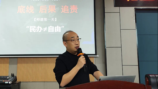 “為師者,先正觀念。”學工處處長鞏非以“師德三觀”開場,用“民辦≠自由”當頭棒喝,警示法治意識是班主任的“生存底線”。