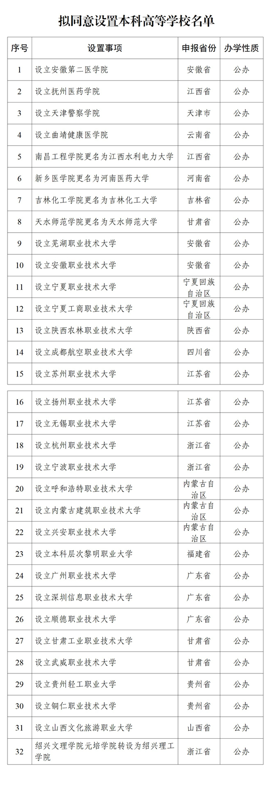 附件:擬同意設置本科高等學校名單(點擊查看)