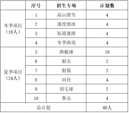 (二)招生項目:高山滑雪、速度滑冰、短道速滑、冬季兩項、曲棍球、射擊、射箭、田徑、羽毛球、拳擊。
