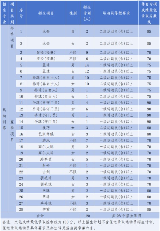 (2)體育專項成績最低錄取控制線:手球項目90分;冰壺、舉重項目85分;技巧、藝術(shù)體操、網(wǎng)球項目80分;籃球、排球項目75分;其他項目70分。具體見各項目招生計劃表。