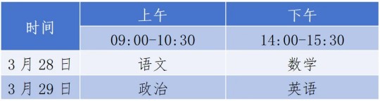 考生按照準考證上的考點信息于2026年3月28日至29日參加文化考試。文化考試時間安排如下: