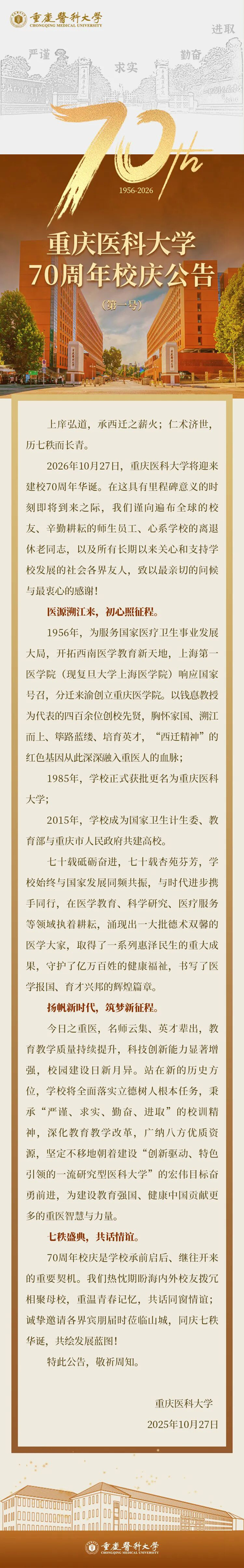 重慶醫科大學70周年校慶公告(第一號)
