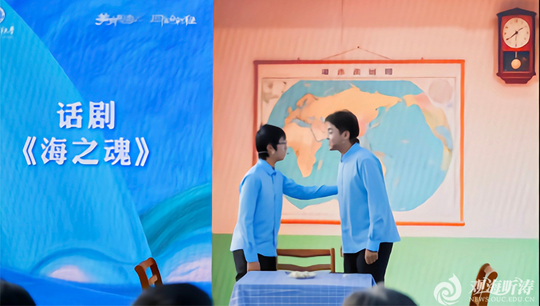 現(xiàn)場藝術演繹精彩紛呈,基礎教學中心藝術系學生、大學生藝術團及海鷗劇社先后帶來合唱《問道滄!、聲韻合頌《藍色夢想》、話劇《海之魂》、情境敘事合唱《藍色暢想》等節(jié)目。《問道滄海》回溯學校百年辦學初心,《海之魂》再現(xiàn)革命烈士科研報國的英雄事跡,多樣藝術形式讓理論宣講更具感染力,實現(xiàn)了思想引領與審美體驗的同頻共振。