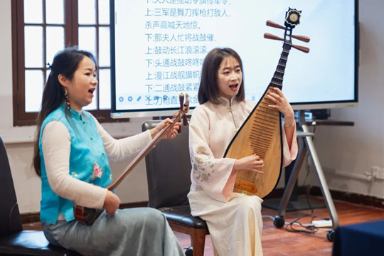 最后,在互動環節,兩位嘉賓選取了一些評彈演奏中的常用語,如“你”“我”“他”等,逐字逐句地教大家發音,現場黨員積極跟隨學習,氣氛十分熱烈。她們帶領現場黨員學唱評彈《鶯鶯拜月》的片段和蘊含江南韻味的歌曲《聲聲慢》,吳儂軟語搭配清雅的三弦、琵琶伴奏,展現了傳統樂曲的韻味,活動在《聲聲慢》的動人合唱中結束。