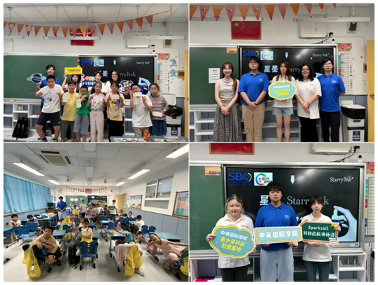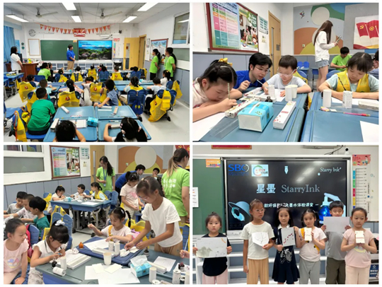 7月7日、17日、29日及8月14日,中英國際學院的老師、創新領導力中心的學生們及星墨科創團隊成員組成科創講師團,在雁蕩路七色花小學開展了主題為“星墨:環保彩色墨水課堂”的研學活動,為瑞金二路街道暑托班二至五年級的孩子們,帶來了一場融合美育與科創的奇妙體驗。課堂從“墨水的前世今生”娓娓道來,通過課件展示、視頻講解、互動提問等豐富形式,幫助孩子們學習色彩的原理,了解墨水的起源。實踐環節,天然植物制成的安全環保彩色墨水變身為教具,孩子們化身“小小畫家”,嘗試使用玻璃筆和彩色墨水創作畫作,在動手實踐中感受科技與藝術的交融!霸瓉砟梢赃@么環保又漂亮!”一位三年級學生在完成作品后興奮地說道。孩子們在一片歡聲笑語中增長本領見識,啟蒙科創思維。
