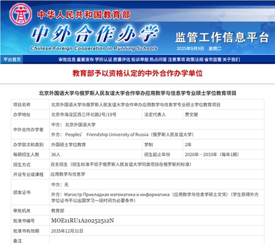 近日,教育部中外合作辦學監管工作信息平臺公布經批準設立和舉辦的中外合作辦學項目名單,北京外國語大學與俄羅斯人民友誼大學合作舉辦的應用數學與信息學專業碩士學位教育項目通過資格認定,將于2026年秋季啟動首批招生。這是北外獲批設立的第五個中外合作辦學項目。