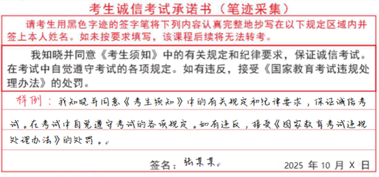 1.落實筆跡信息采集要求。考生應在答題卡指定區域完整抄寫《考生誠信考試承諾書》并簽名(抄寫樣例如下圖),省教育考試院將采集此處的抄寫內容作為考生筆跡信息,并隨課程成績記入考生考籍檔案。