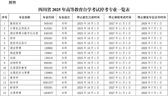 附件:四川省2025年高等教育自學考試停考專業一覽表