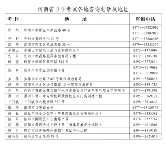 (二)考生在報(bào)名過(guò)程中遇到問(wèn)題可撥打報(bào)名所屬考區(qū)教育招生考試機(jī)構(gòu)咨詢電話(聯(lián)系方式見(jiàn)下文)反映解決問(wèn)題。同時(shí),密切關(guān)注官方網(wǎng)站“河南省教育考試院”(http://www.haeea.cn)、“河南招生考試信息網(wǎng)”(http://www.heao.com.cn)、“河南省高等教育自學(xué)考試考生服務(wù)平臺(tái)(zkwb.haeea.cn)”和官方微信公眾號(hào)“河南省教育考試院”“招考豫言”及各考區(qū)教育招生考試機(jī)構(gòu)發(fā)布的相關(guān)信息。